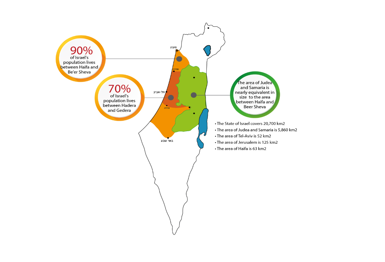 Today 70% of the Jewish population in Israel lives between Netanya and Tel Aviv, only 10% of the country's land. And 90% of the Jewish population live between Be'er Sheva and Haifa – only 20% of the country's land.